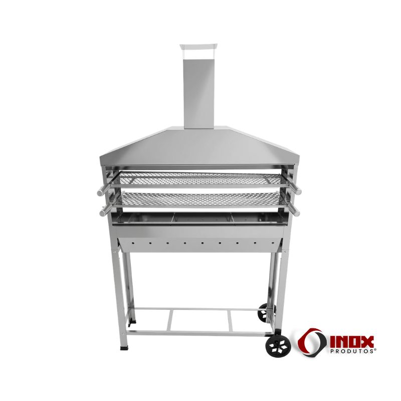 Sua estrutura conta com coifa com chaminé, que auxilia na condução da fumaça, proporcionando um ambiente mais limpo e confortável durante o uso. Além disso, possui cuba de carvão removível, facilitando a limpeza e reposição, e grelhas em tela moeda com cabos térmicos, garantindo segurança e praticidade no manuseio.